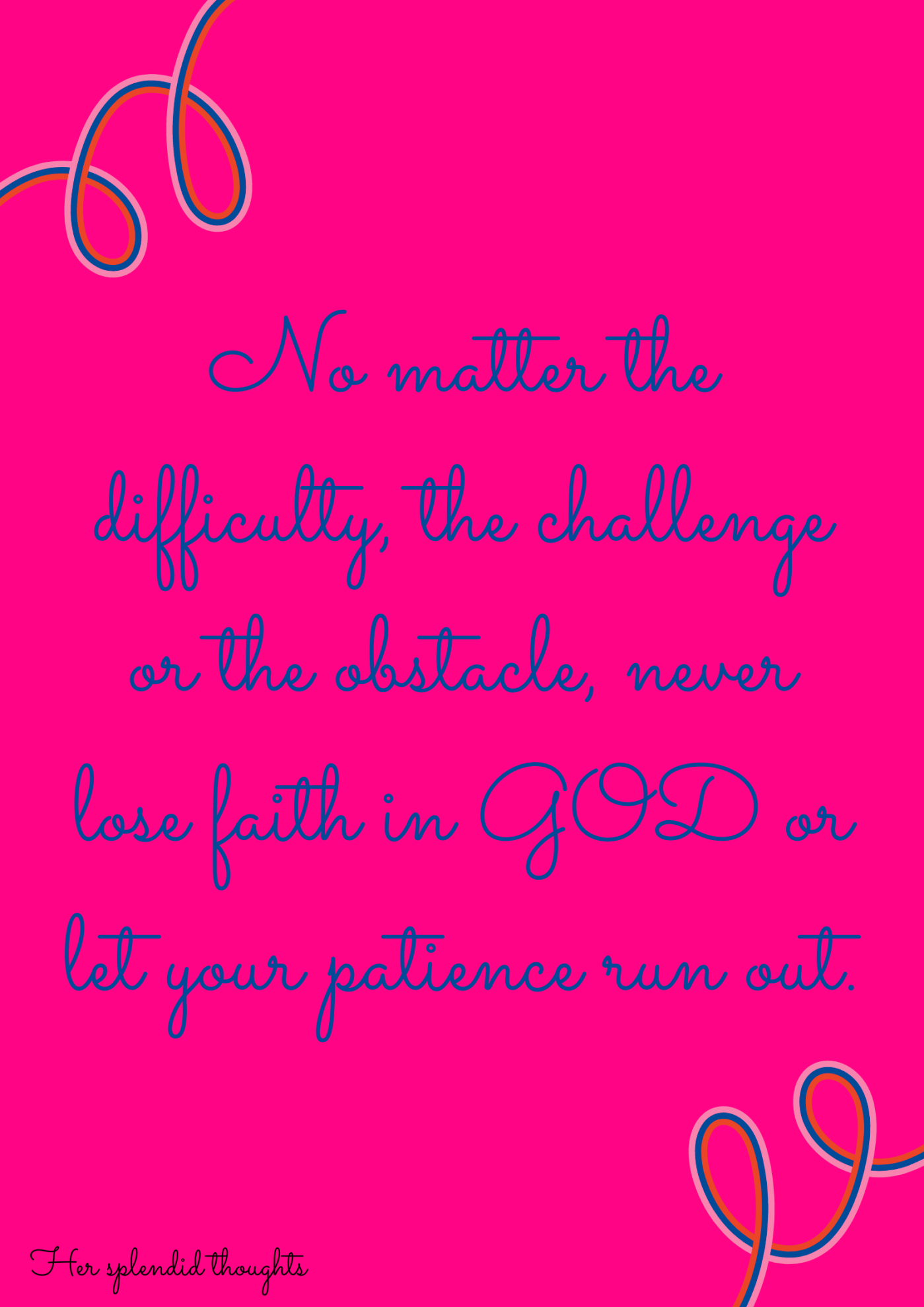 A while back I watched a movie about a couple in trying times and it was like GOD was speaking directly to me; not because I am in their situation, but how HE is always there for us. I learnt that wherever we find ourselves even in the most trying times; we have to remember that GOD’s ways are not our ways and we can never act faster than HE will.