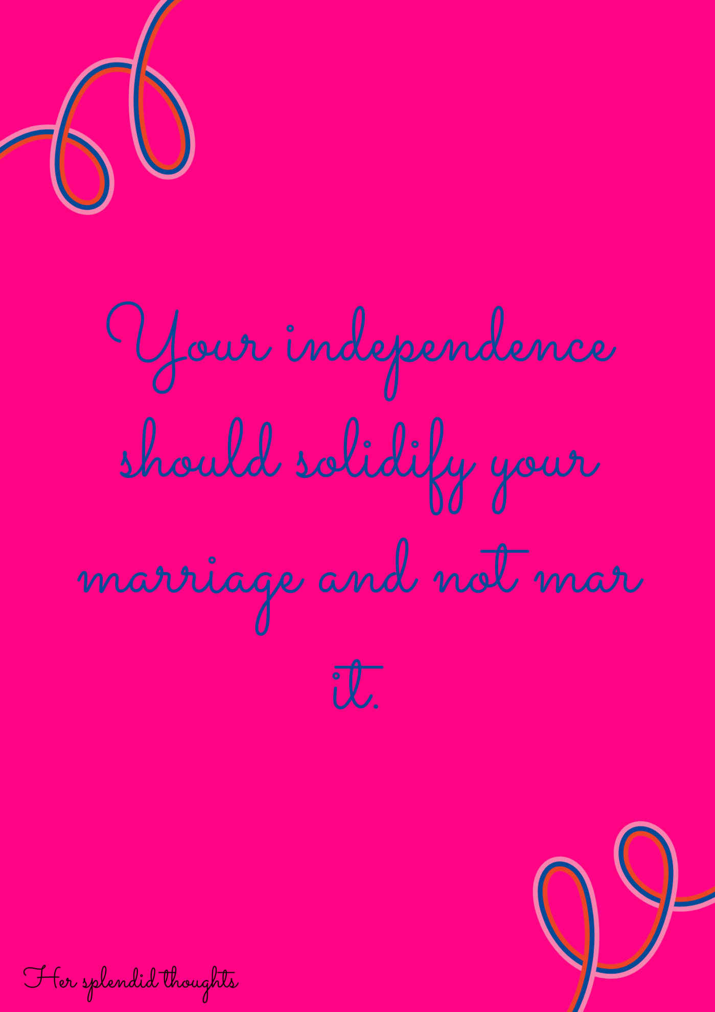 Do not let the world mislead you about making yourself independent, or you are your own person. Certainly, you should be independent, but do not let that get in the way of a solid marriage. Your independence is a foundation and rock to your marriage and not otherwise.